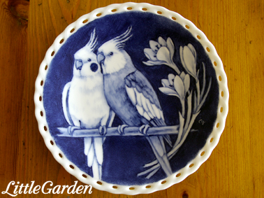 鳥部分の白地を残しながらまず背景を色で潰して、綺麗にお掃除しながら鳥さんを描く‥という面倒な事をしているので、直径15センチの小さなお皿1枚に1日がかりです。