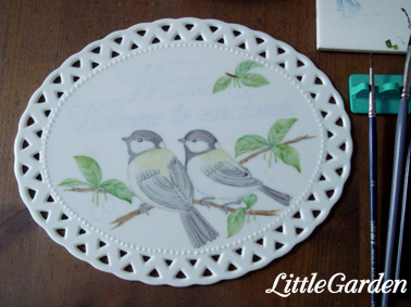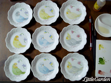 このお皿には以前はトリさんのバスト・ショットを描いていたのですが、飾りとして使う方が多いと聞いていたので全身を入れてみました。
