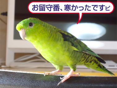 「ただいま〜」と寅をケージから出して鼻でスリスリすると、くちばしが冷たい!