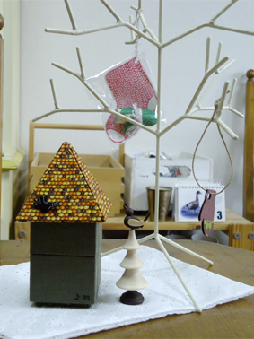 お家と並べた木製の「モミの木」は(しっくり来る風景ですね)、ドイツ製の「鳥寄せ」のおもちゃ。