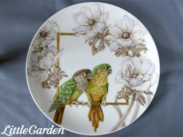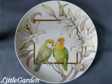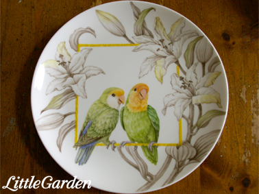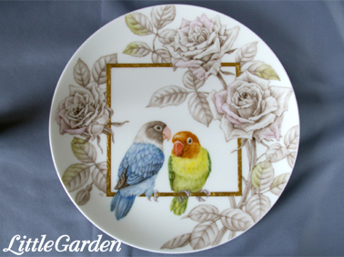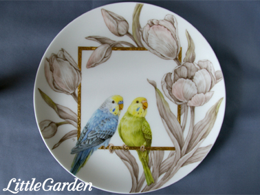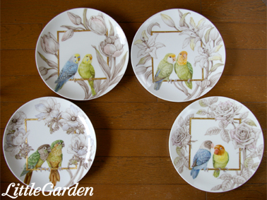 画像は陶画舎展に出展した「インコさんのカップル」のお皿のセットです。