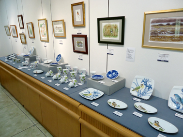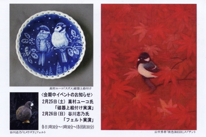 出展予定作家は小林絵里子氏(水彩画)・谷川志乃氏(フェルト)・原千恵子氏(水彩画)・山中秀孝氏(銅版画)・高村ユーコ(磁器上絵付け)他です。