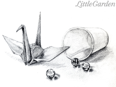 折り紙は、ペラペラの紙のままでは描き難そうなので鶴を折りました。