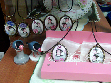 後にズラ〜ッと並んでいるのが、以前にオーダーいただいた「いちごちゃん&ぷりんちゃん」のペンダントです。