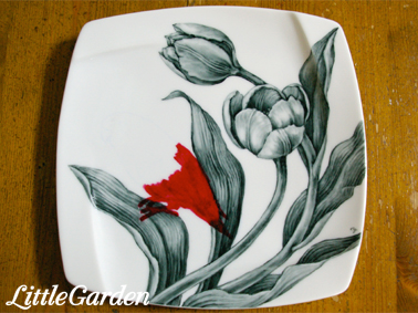 チューリップのお皿の赤い部分はマスキング・リキッド。