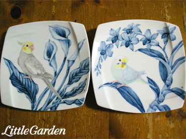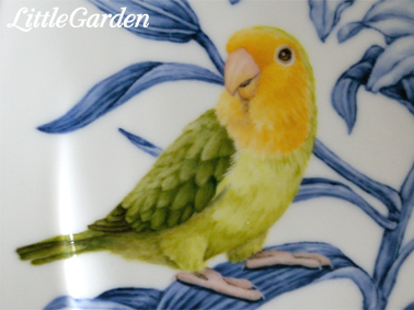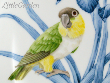 お花はイングレーズで藍色単色、インコさんは上絵付けで色を入れて、仕上げる予定ですが。
