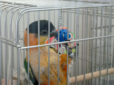 寅ちゃんより1回り小さい看板鳥のボタンインコさん、くりちゃんはおもちゃで遊ぶのがとっても上手。