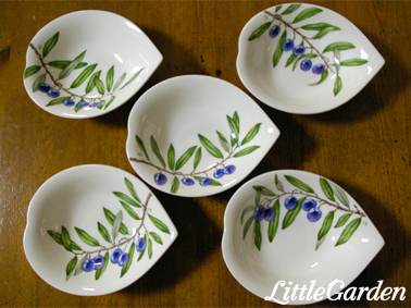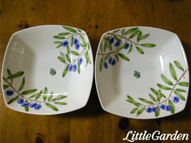 オリーブのモチーフで柄違いの、取り皿とボールのセット。