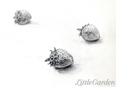 小さな苺を3粒並べて、遠近感も含めての表現です。