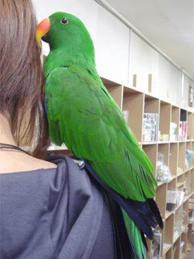 オオハナインコのゴンちゃんはお母さんの留守中、MOREさんでお留守番しているのだそうです。