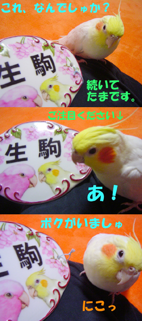 プレートと一緒に写っているのはモデルさんになったモモイロインコのゆうちゃんと、オカメインコのたまちゃんです。