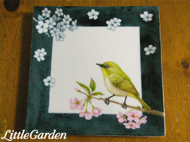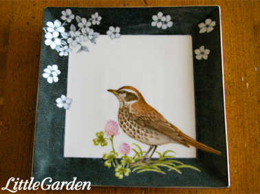 背景の藍色は高温焼成のイングレーズ絵の具、鳥は上絵付けの絵の具、植物はメタリック絵の具‥とそれぞれ焼成温度が違う上に、複数回の焼成をした物もあって手間と時間はかかっているのですが。