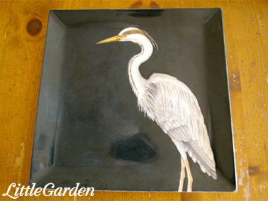 これは1辺27センチくらいの大きな四角皿で、予め白地を残しておいた場所にアオサギを描いているところです。