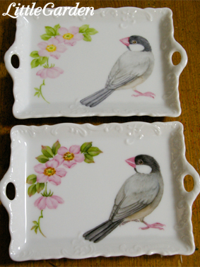 文鳥さんのミニ・トレーは先日のデモンストレーションに使った物で、それぞれ第1焼成と第2焼成を終えた状態です。