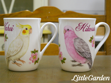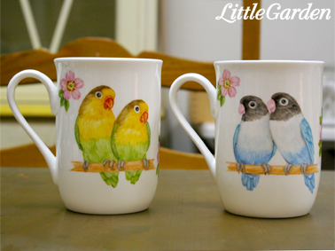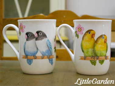 オーダーを頂いているマグカップの裏側、それぞれボタンインコさんのカップルです。