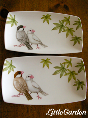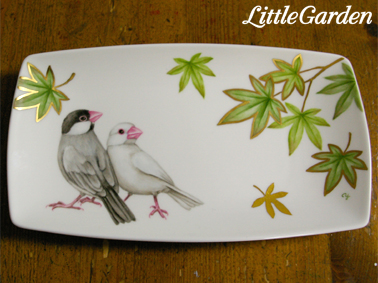 焼き魚でも乗りそうなサイズのお皿は「文鳥さんとモミジ」のモチーフで、2度目の絵付けを終えたところです。