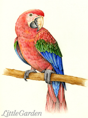 「美しい鳥」という事なので、ベニコンゴウインコさんを描く事に。