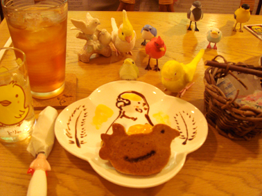 鳥の形のパンケーキをいただきましたが、お皿にリクエストの鳥さんでデコレーションをして下さいますよ。