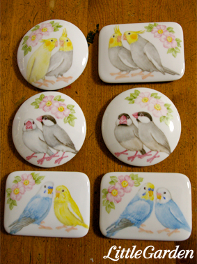 四角いプレートはどちらも1辺18〜9センチ程度の大きさで、鳥さんは4回、セットは6回授業で仕上げました。
