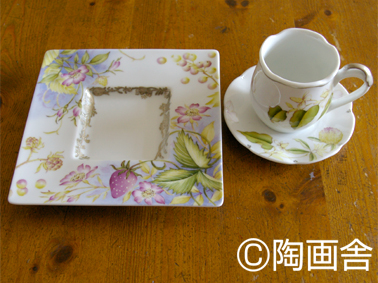 本来のデザインはカップ&ソーサーの縁はグルリとたっぷりプラチナを使っているのですが、勿体ないので(笑)節約しました。
