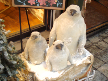 ミョンドンの繁華街の店先で、ペンギンさんの親子の雪だるまを発見しました。
