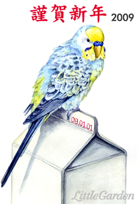 当初は牛のお尻に止まっているトリさんでも描こうかな‥と思っていたのですが、先日Hちゃん宅で「リトルガーデンの年賀状は鳥がメインじゃないと!」という話になりました。