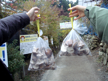 下山してご当地名物の「おっきりこみうどん」を食べた後は、お楽しみのしいたけ刈りに。