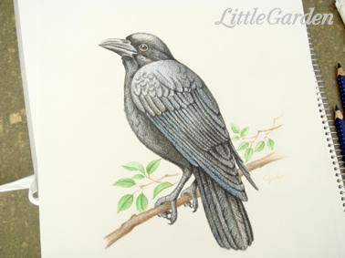 カラスの下書きを終えたまま放置していたので、昨晩からあわてて描き始めました。