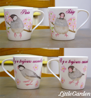 お馴染みの文鳥さんの姉妹、いちごちゃん&ぷりんちゃんの各々のマグです。