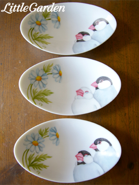 ようやく見つけた楕円のお皿3枚に、文鳥さんとマーガレットを描き始めました。