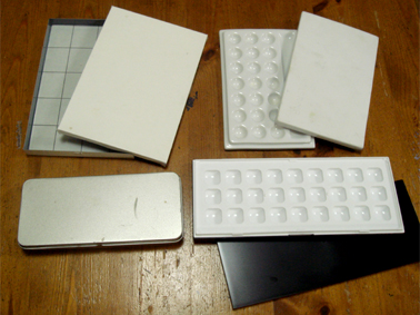 描く時には平らなタイルの上に絵の具を並べますが遅乾性のオイルで溶いた絵の具は翌日くらいまで使えるので、学校の前日に溶いておいたり学校で使った物を持ち帰ったり。