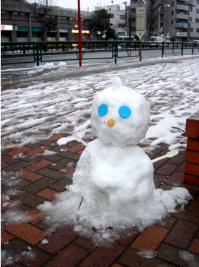 駅前のロータリーで可愛い雪ダルマを発見。