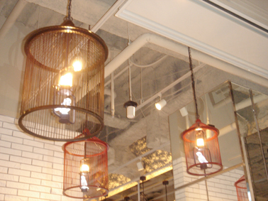 お茶の為に入った中華レストランの天井に、トリ篭のライトが沢山ぶら下がっていました。