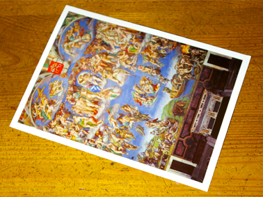 ミケランジェロの「最後の審判」の絵ハガキには「ラファエロやミケランジェロをすごく近くで見て鳥肌をたてています。」と書いてありました。