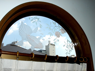 金魚グッズも色々と展示・販売していて、お店の窓ガラスも金魚柄。