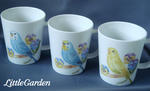 セキセイ・インコさんのマグカップはパンジーの花と一緒に描いてみました。
